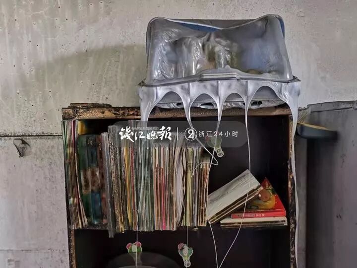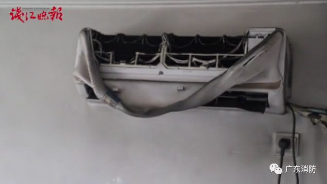 受高温辐射,卧室内的空调壳已经热化变形,门口处的一个塑料盒子,拉出了长长的丝。