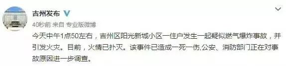 据吉州发布通报:中午1点50左右,吉州区阳光新城小区一住户发生一起疑似燃气爆炸事故,并引发火灾。目前,火情已扑灭。该事件已造成一死一伤,公安、消防部门正在对事故原因进一步调查。