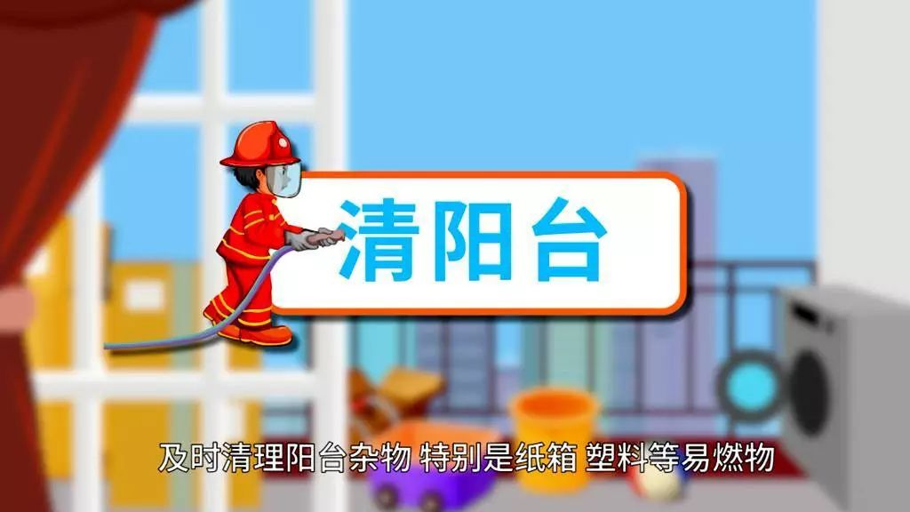 清阳台:要及时清理阳台上的杂物,特别是纸箱、纸皮、塑料等易燃物。长时间外出,要关闭门窗,以免火星飞入家中引起火灾。