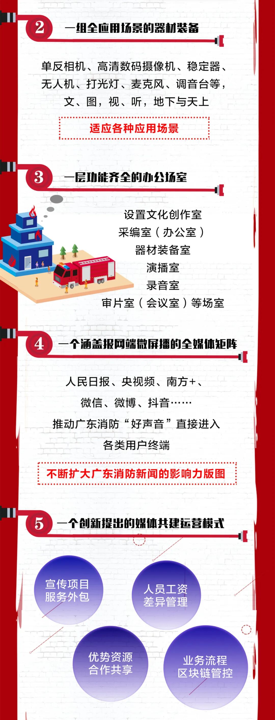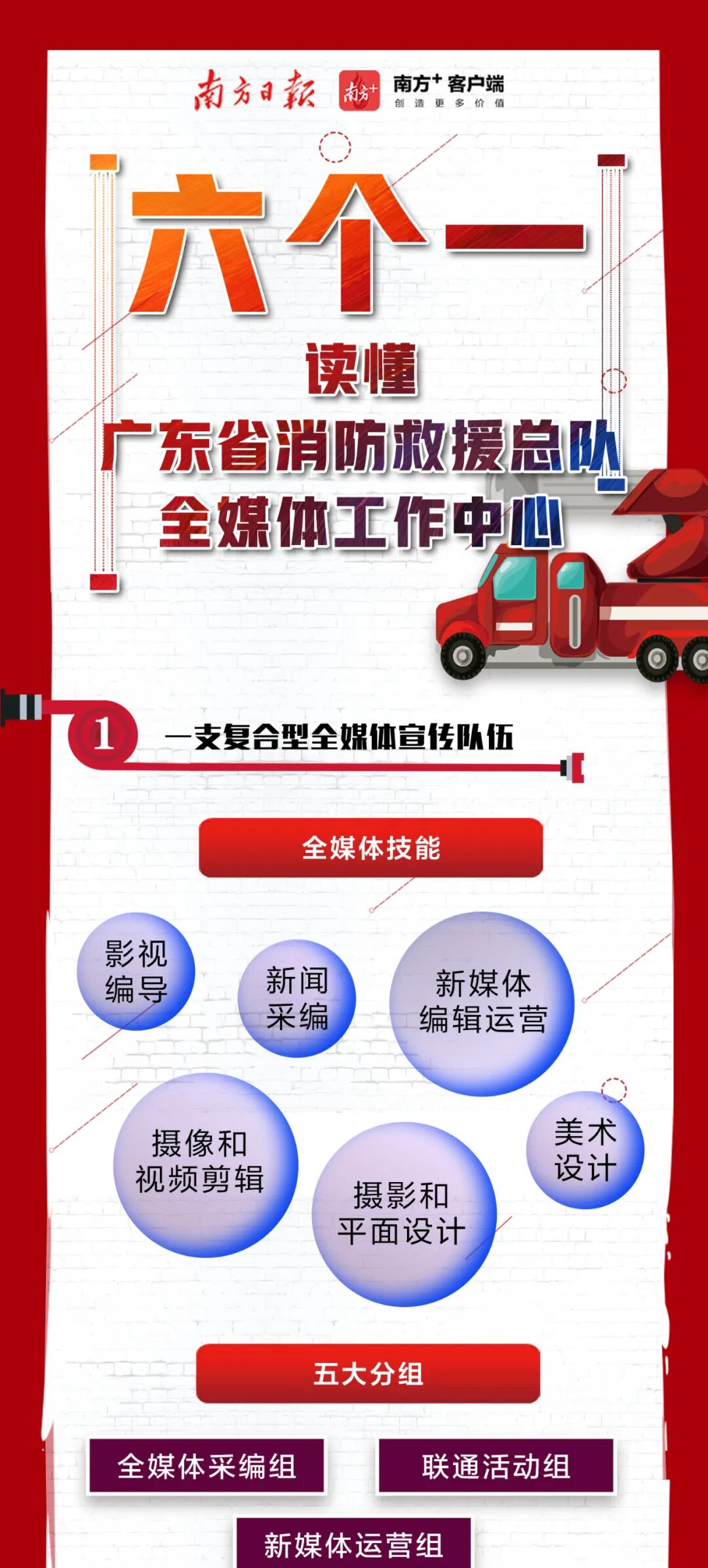 什么是全媒体工作中心? 这里是广东消防宣传的“中枢大脑” 广东省消防救援总队全媒体工作中心是由广东省消防救援总队与南方报业传媒集团联合共建,作为省消防救援总队宣传工作的“大脑中枢”,全媒体工作中心是新闻宣传处内容生产、产品传播和账号运营为一体的“中央厨房”。是推动媒体融合发展,创新移动新闻产品,提升消防宣传的传播力、引导力、影响力、公信力的重要组织保障。 全媒体工作中心能做? 我们,全能! 能写、能拍、能摄、能播、能飞…… 这是一支具备影视编导、新闻采编、新媒体编辑运营、摄像和视频剪辑、摄影和平面设计、美术设计等能力的全媒体宣传队伍,共分成全媒体采编组、联通活动组、新媒体运营组、影音视听组、媒体专家组共5个组。 在全媒体工作中心,我们配齐配强单反相机、高清数码摄像机、稳定器、无人机、打光灯、麦克风、调音台等设备,练强十八般武艺+熟悉最精尖的装备,只为给最帅的消防“蓝朋友”们疯狂打call。 我们设置采编室、演播室、录音室、审片室、器材装备室、文化创作室等场室。我们从采编室走出,携“武器”奔赴一线与消防指战员同作战;一天24小时,一年365天,我们从不缺席。 人民日报、央视频、南方+、微信、微博、抖音……我们建立一个媒体矩阵,打通和整合了采编资源,配强采编人员和设备,确保新闻采集编辑发布的高效、流畅、便捷,满足“一次采集、多种生产、全媒传播”要求。 未来,全媒体工作中心将以移动化、平台化、可视化、智慧化为重点,建设全媒体传播体系, 推动省消防救援总队全媒体产品与服务进入各类用户终端,实现多样化展示、多介质推送、多元化传播,提升融合传播效能,让声音传得更开广、更深入,争取建成全国先进的总队级全媒体工作中心。 一图读懂全媒体工作中心