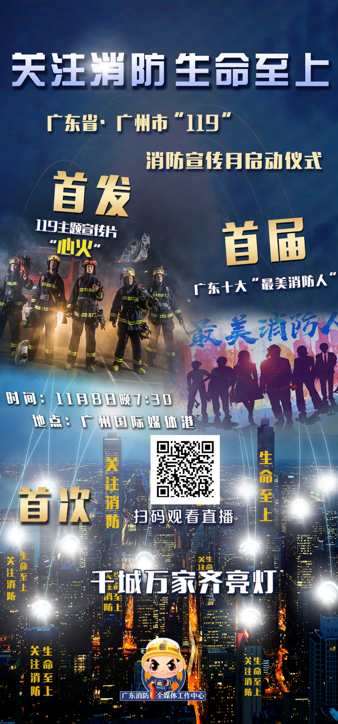 同时,千城万家开展“亮屏”行动,向所有消防工作者表达最深的敬意,全省各地也会在地标建筑、楼宇屏幕、大型户外显示屏、公交站牌“亮”出你熟悉的“蓝朋友”面孔!向他们致敬!你的偶像即将揭晓!11月8日,敬请关注我们的“119”消防之夜吧!