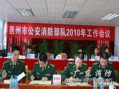 惠州市公安消防部队2010年工作会议于2月26日上午在支队机关会议室隆重召开。支队司、政、后、防四部门对今年的工作作了具体部署和谋划,各县区大队军政主官与支队党委签订了工作责任状,明确了新一年工作目标、主要任务和具体要求。支队在家党委成员、机关部门副职以上领导、各大中队军政主官、各县区专职消防队队长共计80余人参加会议。会上,支队司令部胡林弟参谋长、政治处林国阳主任、后勤处段建国处长、防火处邓海宇处长分别就各部门新一年工作重点作了详细部署。